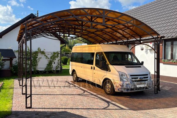 Zastřešení obloukovou střechy z dutinkového polykarbonátu. Kotvení na betonový základ pomocí ocelových hmoždinek. Montovaný přístřešek na auto se dodává v rozebraném stavu.